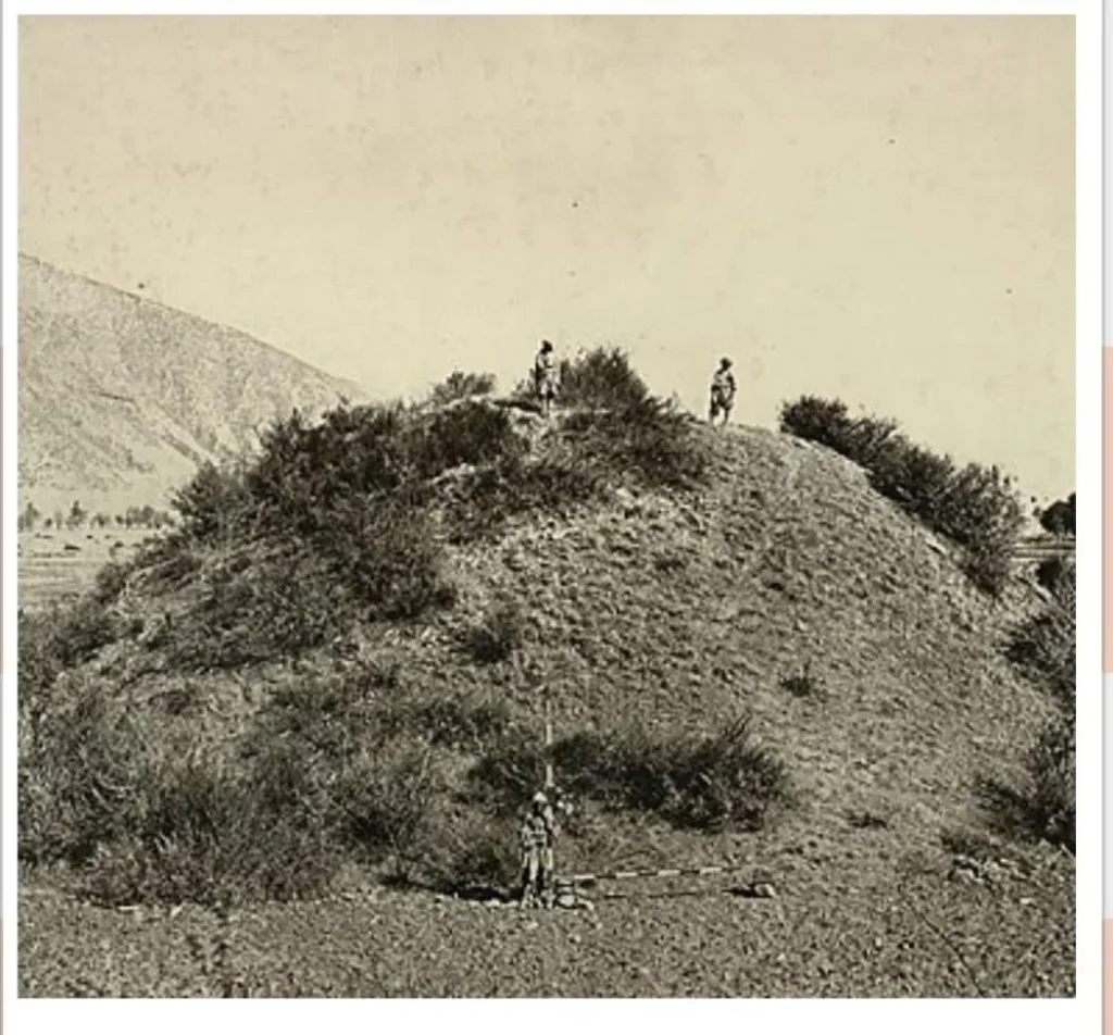 This general view of the unexcavated Buddhist stupa near Baramulla, with two figures standing on the summit, and another at the base with measuring scales, was taken by John Burke in 1868.